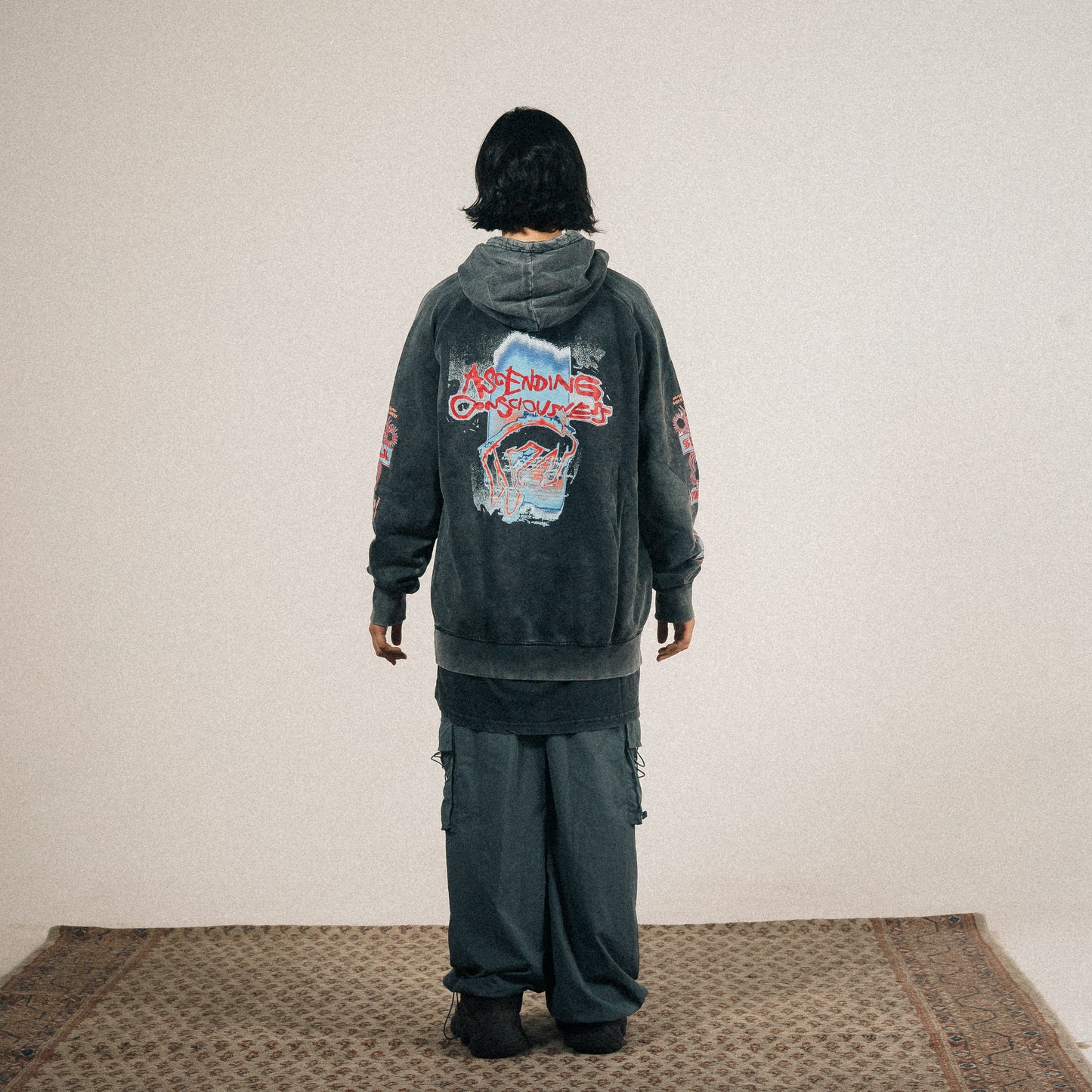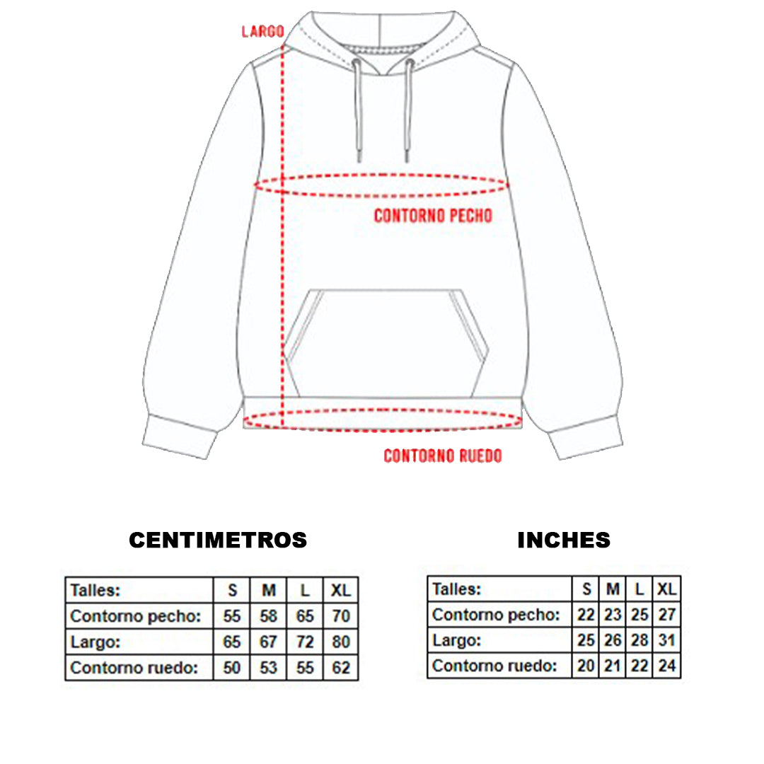 Sudadera rústica con capucha extragrande, ojales con cordón en el cuello, en tejido base a juego. Bolsillos laterales delanteros. Estampado en la parte delantera, trasera y mangas (no planchar sobre el estampado). 100 % algodón.